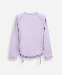 Camiseta infantil confeccionada em malha de poliamida com proteção 50+fps uva e uvb. A camiseta possui gola redonda, mangas longas, cordão aplicado nas laterais com efeito franzido e acabamento pespontado. Composição: 90% poliamida 10% elastano Instruções de lavagem: - Lavar à temperatura máxima de 40ºC - Proibido o alvejamento - Não secar em tambor - Secagem em varal à sombra - Não passar - Limpeza à úmido, processo normal
