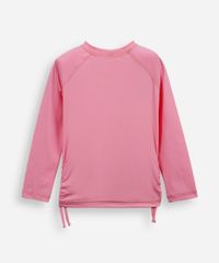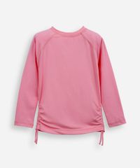 Camiseta infantil confeccionada em malha de poliamida com proteção 50+fps uva e uvb. A camiseta possui gola redonda, mangas longas, cordão aplicado nas laterais com efeito franzido e acabamento pespontado. Composição: 90% poliamida 10% elastano Instruções de lavagem: - Lavar à temperatura máxima de 40ºC - Proibido o alvejamento - Não secar em tambor - Secagem em varal à sombra - Não passar - Limpeza à úmido, processo normal