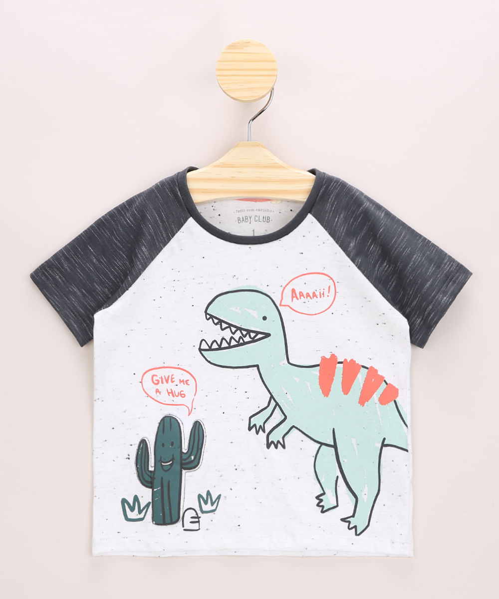 Camiseta infantil desenvolvido em malha botonê. O destaque da peça é sua estampa de dinossauro conversando com cactos. A gola é careca e as mangas curtas são na modelagem raglan, feitas em malha flamê contrastante.