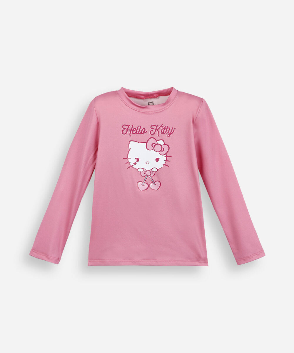 Camiseta infantil confeccionada em malha com proteção uv. A blusa possui gola redonda, mangas longas, caimento reto, estampa frontal localizada da personagem "Hello Kitty" e acabamento pespontado. Composição: 60% poliéster 10% elastano Instruções de lavagem: - Lavar à temperatura máxima de 40ºC - Proibido o alvejamento - Não secar em tambor - Secagem em varal à sombra - Passar à temperatura média - Limpeza à úmido, processo normal