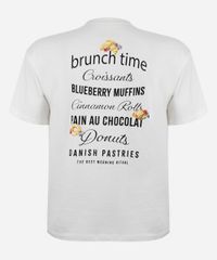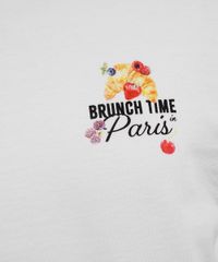 Camiseta infantil confeccionada em malha macia de algodão com estampa localizada escrita na parte frontal e posterior com imagem de "croissant". A peça tem a modelagem reta e o caimento é confortavelmente solto ao corpo. O modelo tem gola redonda em tecido com textura canelada e as mangas são curtas com acabamento pespontado nos punhos e na barra.