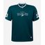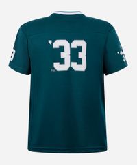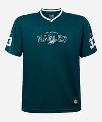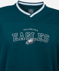 Camiseta juvenil confeccionada em malha com estampa localizada temática do time Eagles na parte frontal e posterior. A peça tem a modelagem reta e o caimento é confortavelmente solto ao corpo. O modelo tem gola v em tecido com textura canelada e as mangas são curtas com acabamento pespontado nos punhos e na barra.