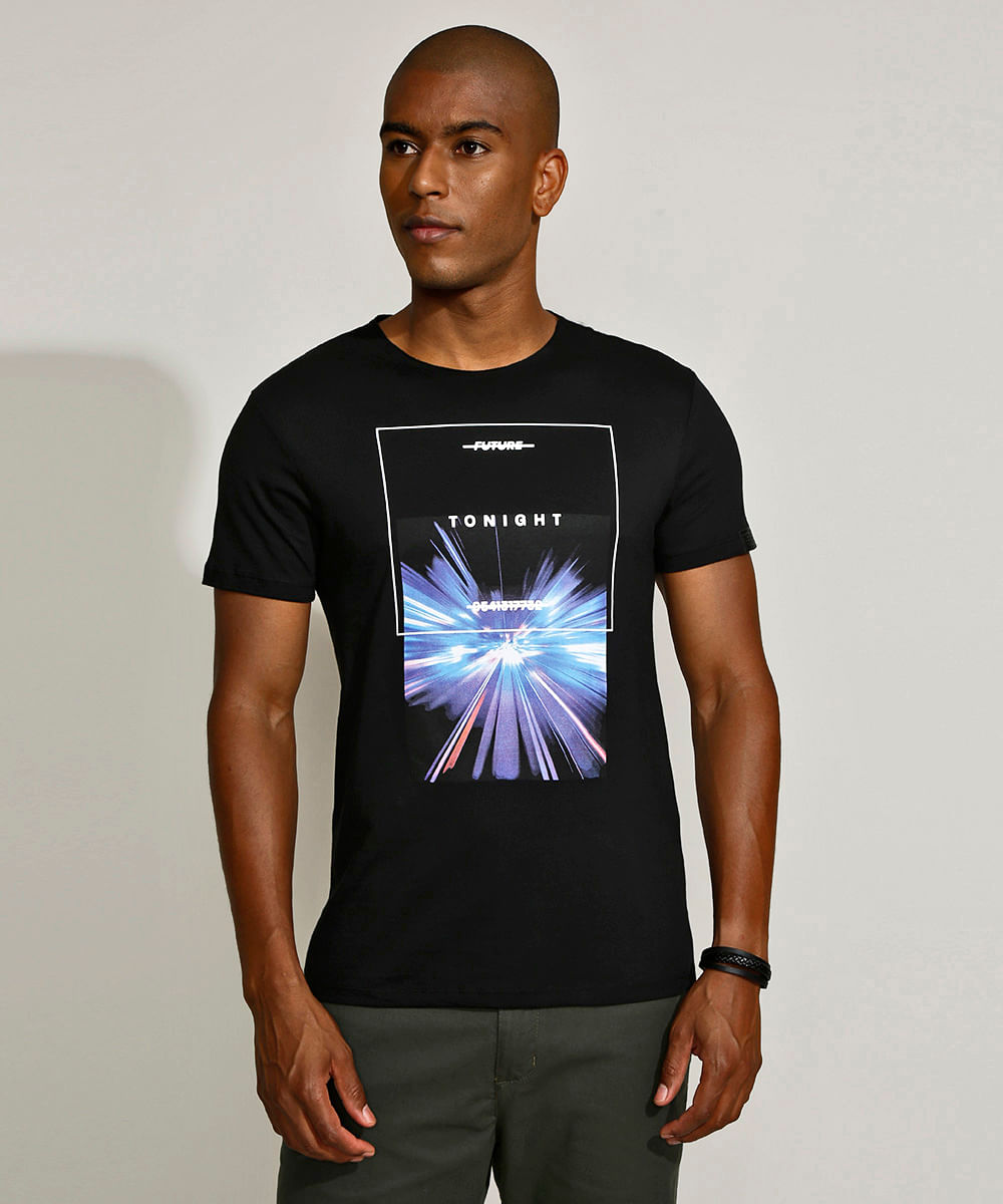 Camiseta masculina desenvolvida em malha. Tem estampa com o texto "Tonight". A modelagem slim é mais ajustada e sofisticada. O modelo possui mangas curtas e gola careca com acabamento canelado.