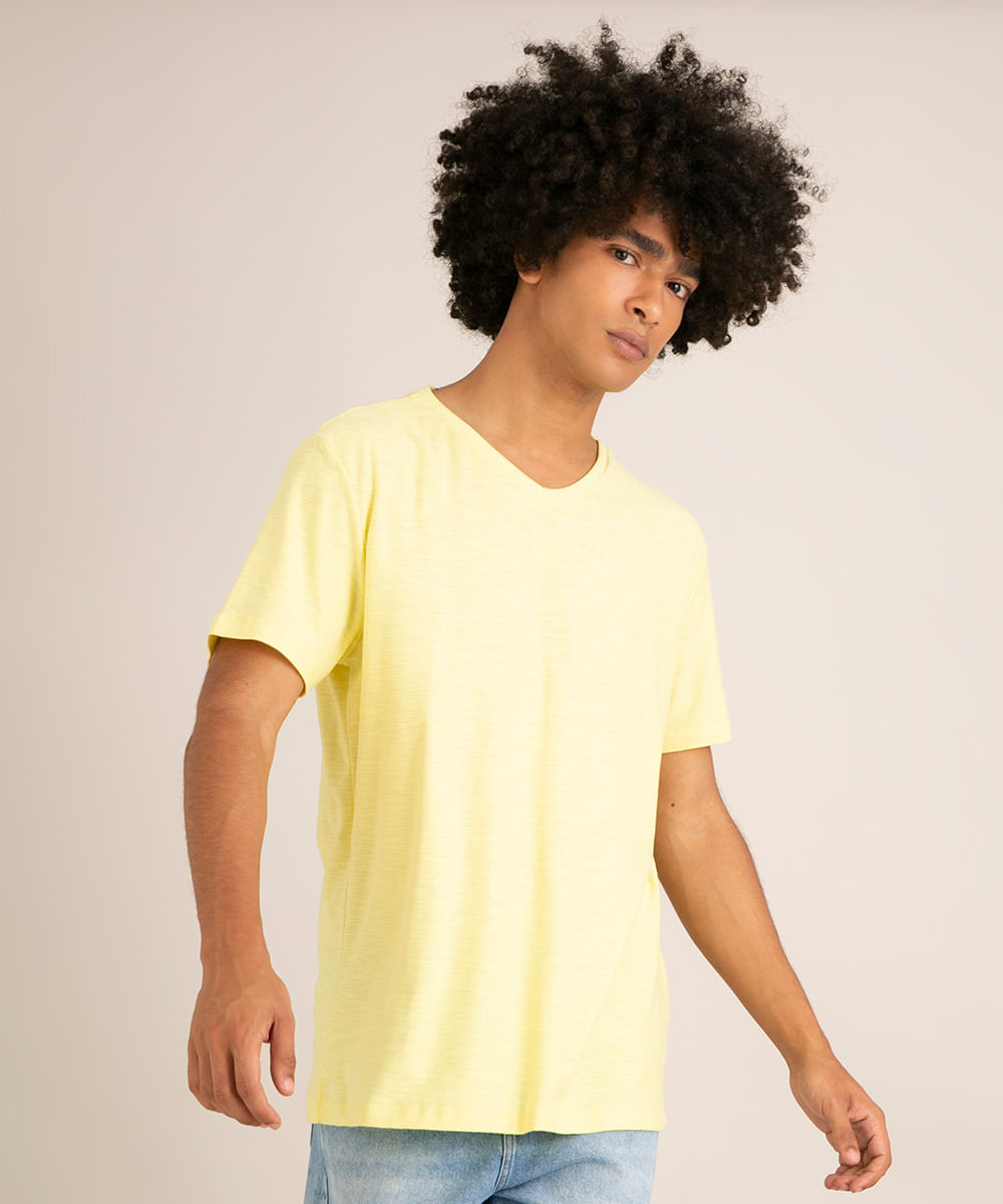 Camiseta masculina confeccionada em malha flamê. A modelagem é reta com caimento soltinho. O modelo tem gola V com acabamento canelado e mangas curtas.
