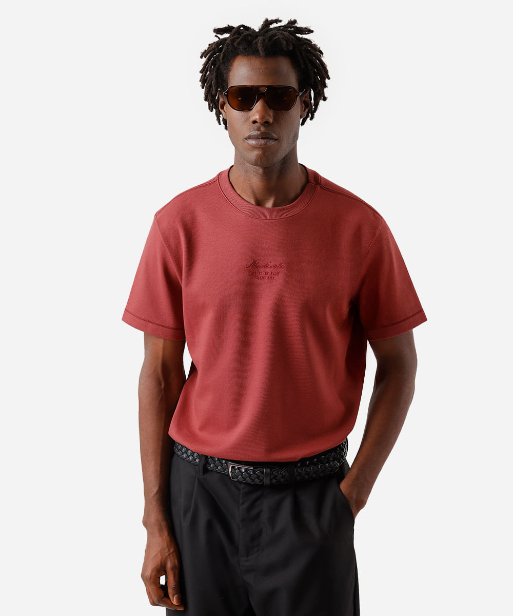 Camiseta masculina confeccionada em malha macia com algodão e bordado com escritos em inglês na parte frontal. A peça tem a modelagem reta e o caimento é confortavelmente solto ao corpo. O modelo tem gola redonda em tecido com textura canelada e as mangas são curtas com acabamento pespontado nos punhos e na barra.