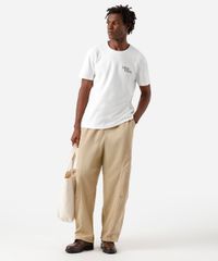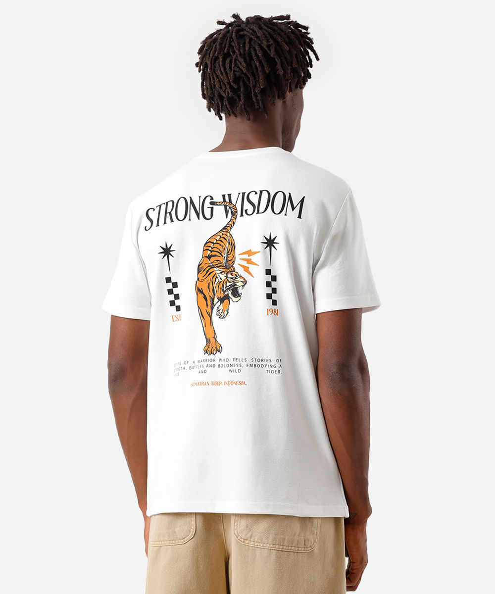 Camiseta masculina confeccionada em malha macia com algodão e estampa localizada em temática de tigre na parte frontal e posterior. A peça tem a modelagem reta e o caimento é confortavelmente solto ao corpo. O modelo tem gola redonda em tecido com textura canelada e as mangas são curtas com acabamento pespontado nos punhos e na barra.