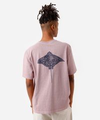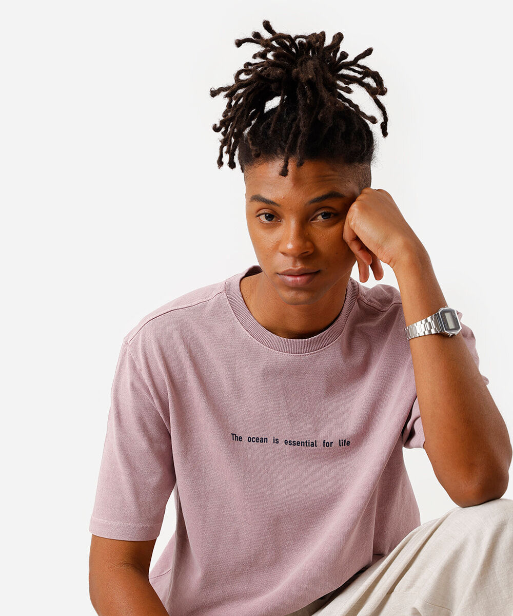 Camiseta masculina confeccionada em malha estonada de algodão e estampa localizada escrito "the ocean is essential for life" na parte frontal e ilustração de arraia na parte posterior. A peça tem a modelagem e construção reta e o caimento é confortavelmente solto ao corpo. O modelo tem gola redonda em tecido com textura canelada e as mangas são curtas com acabamento pespontado nos punhos e na barra.