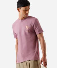 Camiseta masculina confeccionada em malha estonada de algodão com estampa localizada floral na parte frontal. A peça tem a modelagem reta e o caimento é confortavelmente solto ao corpo. O modelo tem gola redonda em tecido com textura canelada e as mangas são curtas com acabamento pespontado nos punhos e na barra.