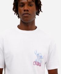 Camiseta masculina confeccionada em malha macia com algodão com estampa localizada do Stitch na parte frontal. A peça tem a modelagem reta e o caimento é confortavelmente solto ao corpo. O modelo tem gola redonda em tecido com textura canelada e as mangas são curtas com acabamento pespontado nos punhos e na barra.