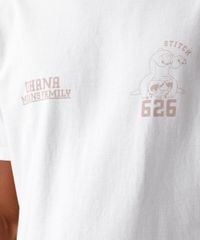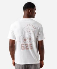 Camiseta masculina confeccionada em malha macia de algodão com estampa localizada do Stitch na parte frontal e posterior. A peça tem a modelagem reta e o caimento é confortavelmente solto ao corpo. O modelo tem gola redonda em tecido com textura canelada e as mangas são curtas com acabamento pespontado nos punhos e na barra.