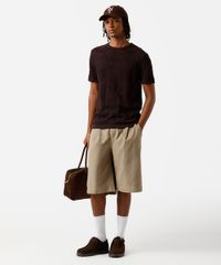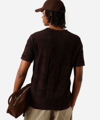Camiseta masculina confeccionada em tricot de algodão com padronagem floral. A peça tem a modelagem reta e o caimento é confortavelmente solto ao corpo. O modelo tem gola redonda e as mangas são curtas.