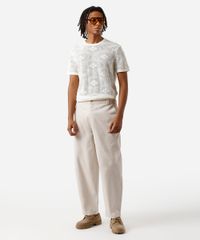 Camiseta masculina confeccionada em tricot de algodão com padronagem floral. A peça tem a modelagem reta e o caimento é confortavelmente solto ao corpo. O modelo tem gola redonda e as mangas são curtas.