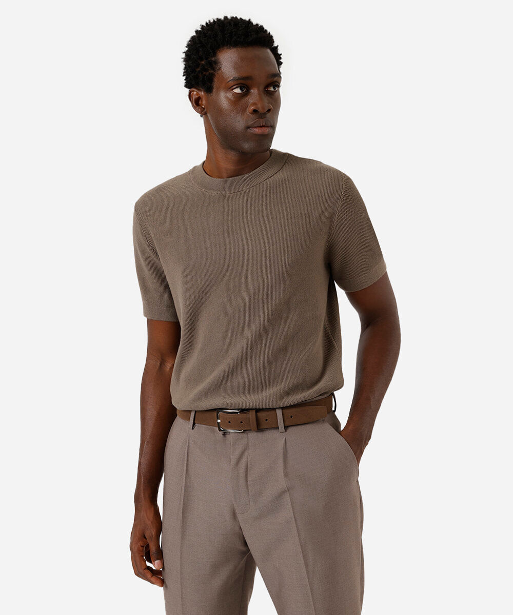 Eleve seu estilo com esta camiseta masculina de tricô, uma peça que combina a sofisticação de uma malha texturizada com o conforto do algodão. Perfeita para transitar entre o ambiente de trabalho e momentos de lazer, seu caimento reto e toque macio garantem bem-estar ao longo do dia. É a escolha ideal para quem busca um visual moderno e versátil sem abrir mão da comodidade.