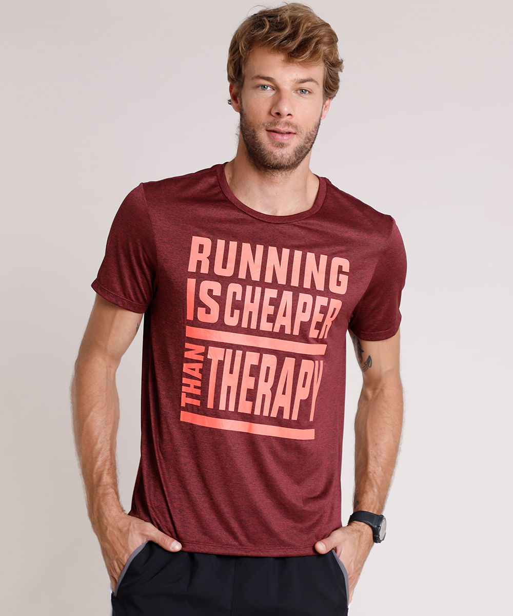 Camiseta masculina confeccionada em malha mescla leve com tecnologia Technofit, ideal para a prática de exercícios, pois é leve e não retém calor. Possui estampa frontal com o texto "Running is cheaper than therapy". O decote é careca com acabamento canelado e as mangas são curtas.