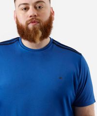 Camiseta masculina confeccionada em malha. A peça tem a modelagem reta e o caimento é confortavelmente solto ao corpo. O modelo tem gola redonda em tecido com textura canelada, as mangas são curtas com acabamento pespontado nos punhos e na barra e listras contrastantes nos ombros.