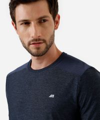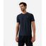 Camiseta masculina confeccionada em malha. A peça tem a modelagem reta, caimento confortavelmente solto ao corpo e recortes nos ombros. O modelo tem gola redonda em tecido com textura canelada e as mangas são curtas com acabamento pespontado nos punhos e na barra.