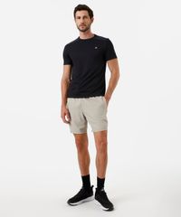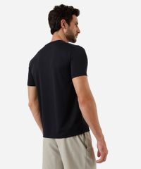 Camiseta masculina confeccionada em malha texturizada. A peça tem a modelagem reta e o caimento é confortavelmente solto ao corpo. O modelo tem gola redonda em tecido com textura canelada, recortes nos ombros e mangas curtas com acabamento pespontado nos punhos e na barra.