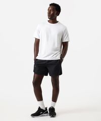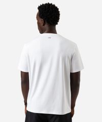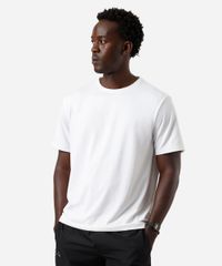 Camiseta masculina confeccionada em malha. A peça tem a modelagem reta e o caimento é confortavelmente solto ao corpo. O modelo tem gola redonda em tecido com textura canelada e as mangas são curtas com acabamento pespontado nos punhos e na barra.