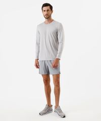 Camiseta masculina confeccionada em malha com proteção UV. A peça tem a modelagem reta e caimento levemente ajustado ao corpo. O modelo tem gola redonda e as mangas são longas com pesponto nos punhos e na barra.