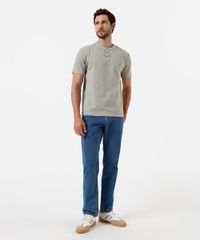 Camiseta masculina confeccionada em malha texturizada com algodão. A peça tem a modelagem reta e o caimento é confortavelmente solto ao corpo. O modelo tem gola redonda com fechamento por botôes em tecido com textura canelada e as mangas são curtas com acabamento pespontado nos punhos e na barra.