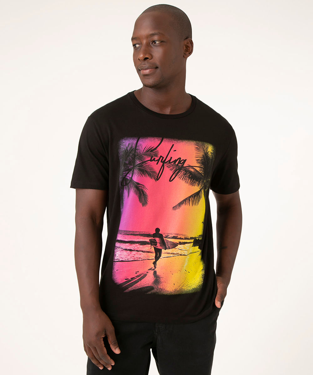 • Estampa frontal localizada com tema de surf em efeito degradê, trazendo uma vibe descontraída e moderna.