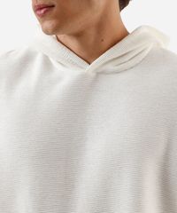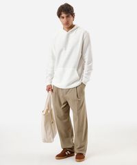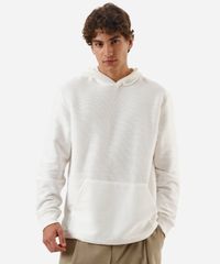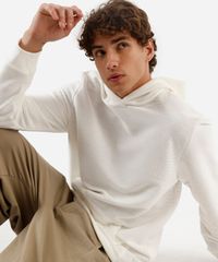 Camiseta masculina confeccionada em malha canelada com algodão. A peça tem a modelagem reta e caimento solto ao corpo. O modelo tem capuz fixo e forrado e as mangas são longas com punhos aplicados. Possui um bolso canguru e acabamento pespontado na barra.