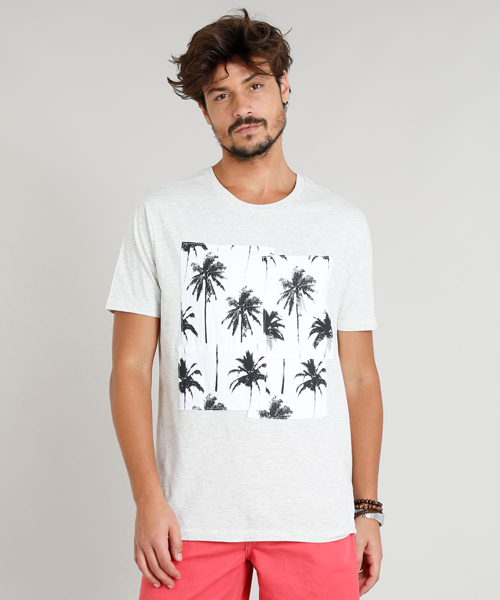 Camiseta masculina desenvolvida em malha mescla. A parte frontal tem recortes com estampa de coqueiros. A gola é careca e as mangas são curtas.