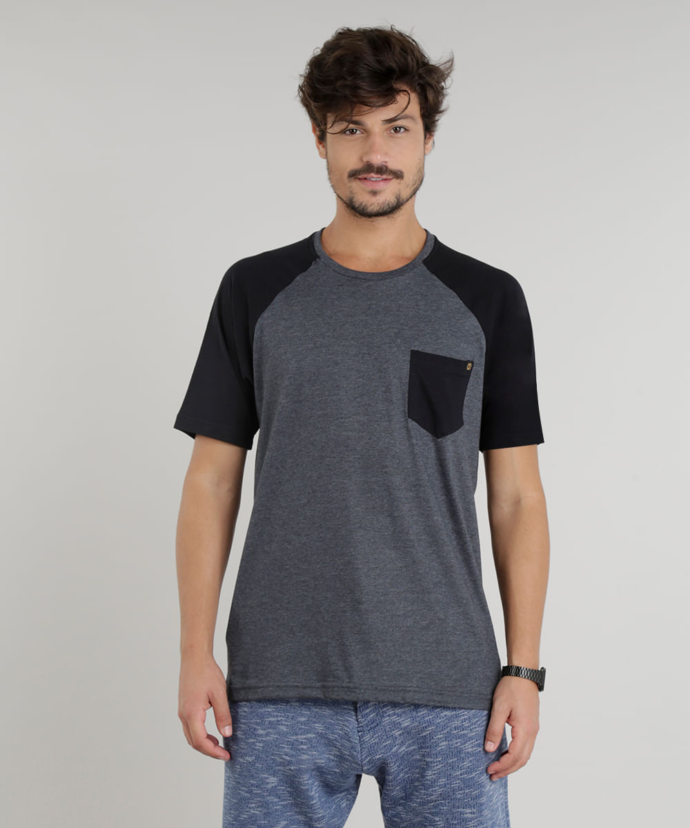 Camiseta masculina confeccionada em malha mescla de toque macio. A parte frontal tem um bolso aplicado. O decote é careca enquanto as mangas curtas contrastantes têm modelagem raglan.