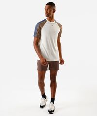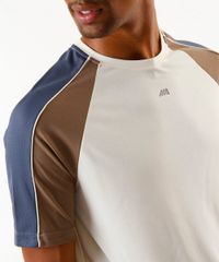 Camiseta masculina confeccionada em malha esportiva. A peça possui gola redonda, mangas curtas modelo raglan em cores contrastantes, caimento reto e solto e acabamento pespontado.