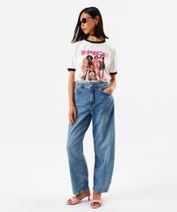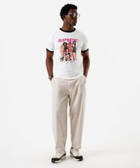 Camiseta masculina confeccionada em malha de algodão. A peça possui gola redonda canelada em cor contrastante, mangas curtas com barra em cor contrastante, estampa frontal localizada da banda "Spice Girls", caimento reto e acabamento pespontado.