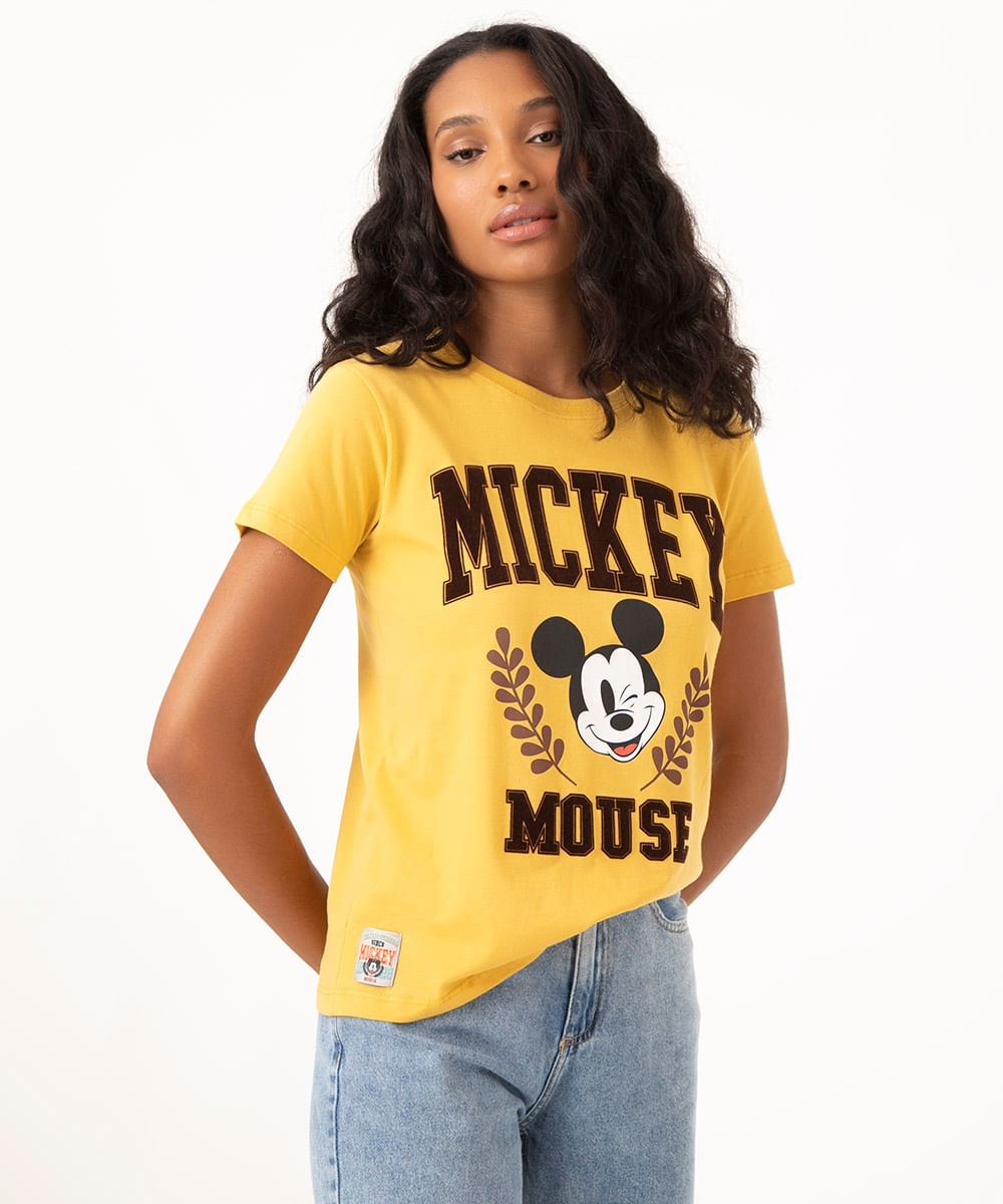 Camiseta confeccionada em malha de algodão. O modelo tem caimento reto, mangas curtas e decote redondo em ribana. Possui estampa frontal do Mickey com detalhe flocado.