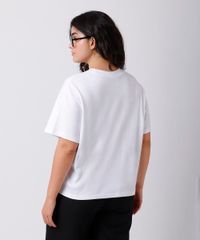 Camiseta feminina confeccionada em malha macia de algodão peruano. A peça tem a modelagem oversized, com construção reta e o caimento é confortavelmente solto ao corpo. O modelo tem gola redonda em tecido com textura canelada e as mangas são curtas com acabamento pespontado nos punhos e na barra.