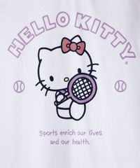 Camiseta infantil confeccionada em malha de algodão e estampa temática da Hello Kitty. A peça tem a modelagem e construção reta e o caimento é confortavelmente solto ao corpo. O modelo tem gola v e mangas raglan curtas. Detalhe de acabamento pespontado na barra.