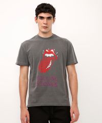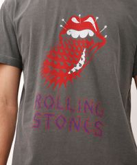 Camiseta masculina confeccionada em malha macia de algodão com estampa localizada da banda Rolling Stones na parte frontal e posterior. A peça tem a modelagem reta e o caimento é confortavelmente solto ao corpo. O modelo tem gola redonda em tecido com textura canelada e as mangas são curtas com acabamento simples nos punhos e na barra.