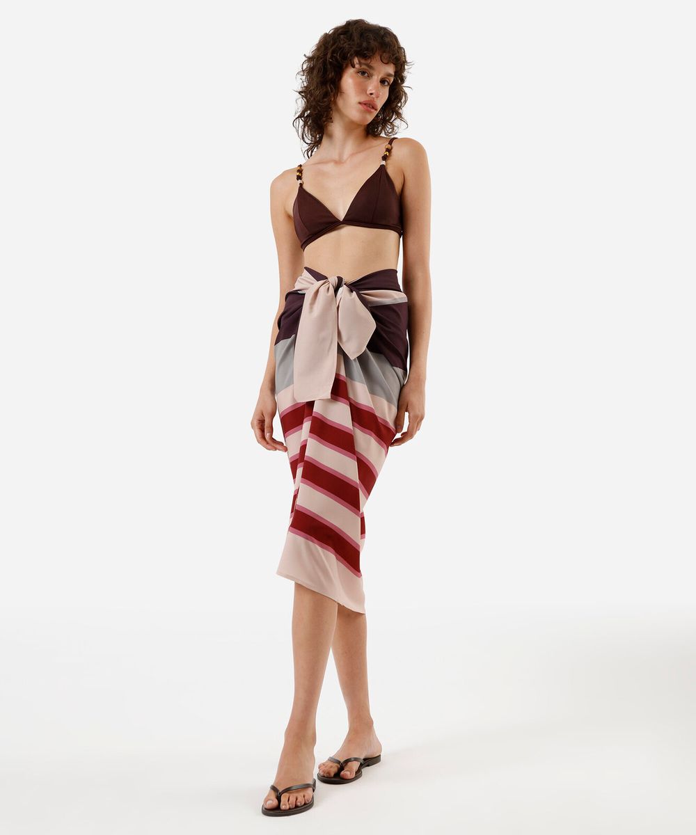 Canga feminina confeccionada em tecido com toque fluido e leve. O modelo possui formato quadrado, padronagem em listras com diferentes espessuras em cores contrastantes e acabamento pespontado.