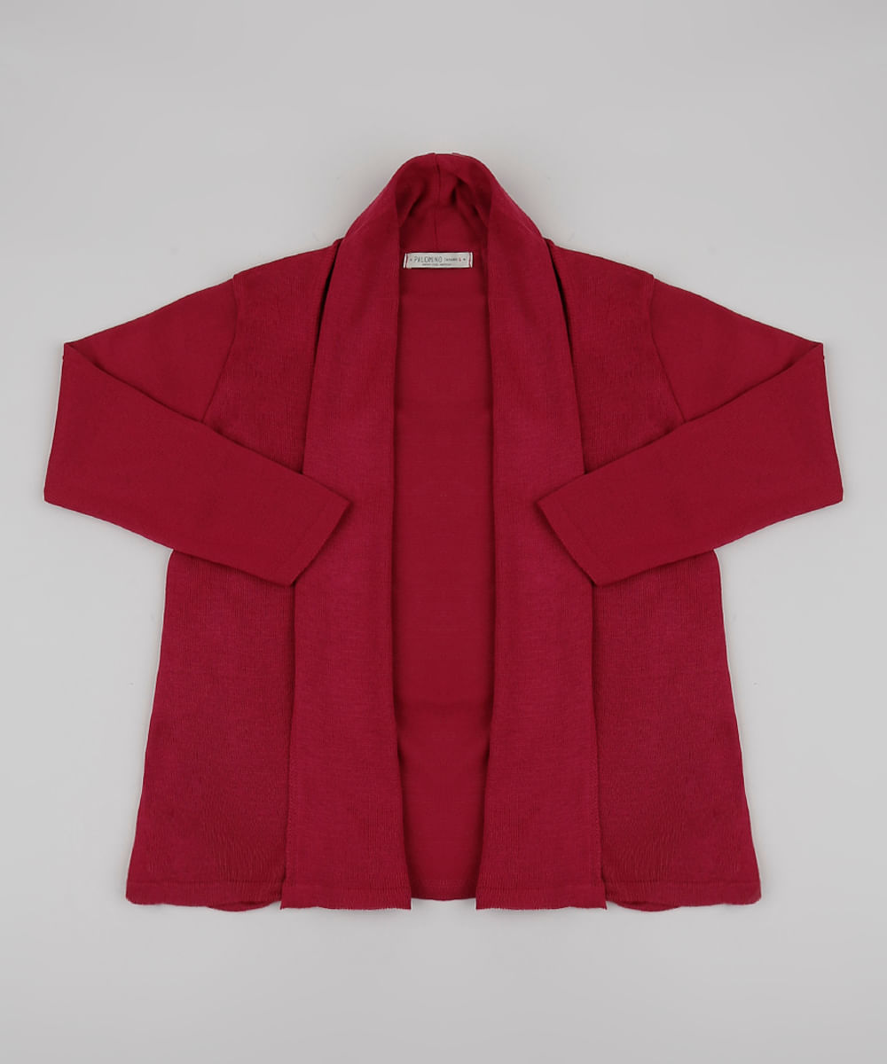 Capa infantil feminina desenvolvida em tricô leve. A gola é ampla e as mangas são longas. A peça não possui fechamento.