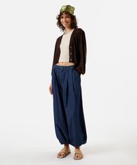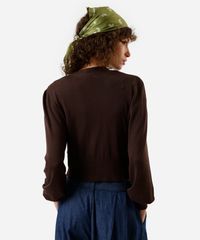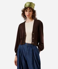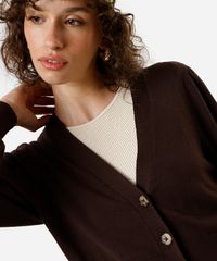 Cardigan feminino confeccionado em tecido tricot leve de viscose e poliamida. A peça tem a modelagem e construção reta e o caimento é solto ao corpo. O modelo tem decote v, fechamento frontal por botões em vista e mangas longas. Detalhe de acabamento canelado nos punhos e na barra.