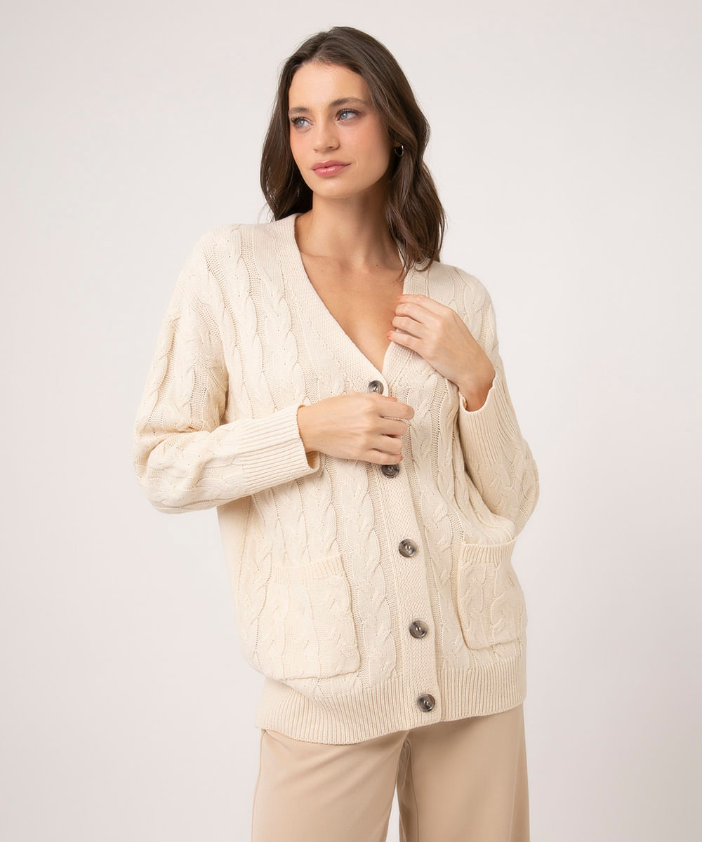 Cardigan confeccionado em tricô com toque macio. A peça possui abertura frontal com decote V e fechamento frontal por botões. Textura de trama frontal, mangas longas, dois bolsos frontais, caimento reto e confortável com acabamento canelado.