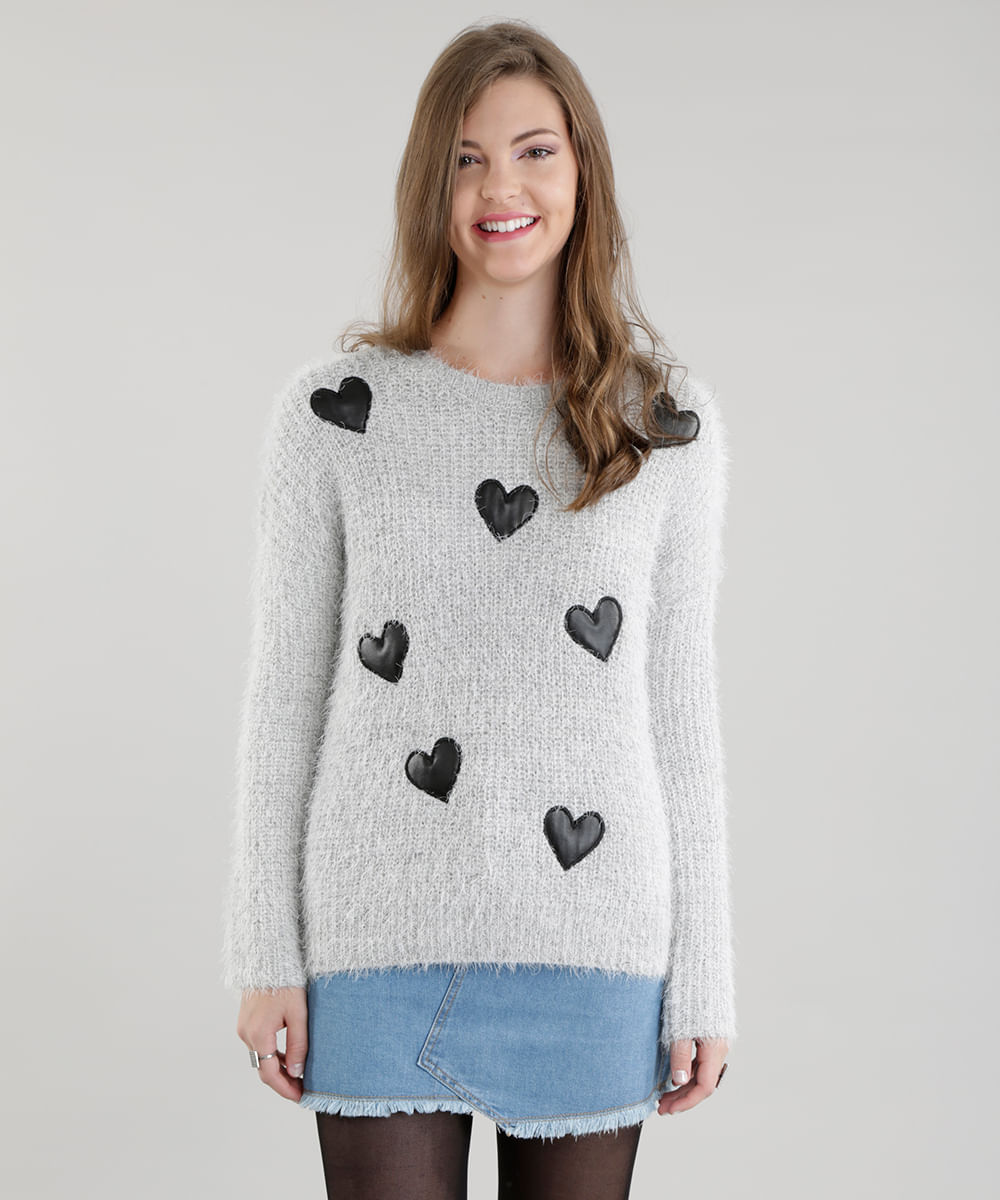 Cardigan desenvolvido em tricô com fios desfiados. O detalhe fica por conta dos bordados de corações na parte frontal. A modelagem mullet tem caimento soltinho. O modelo tem decote arredondado e mangas longas.