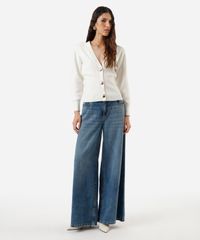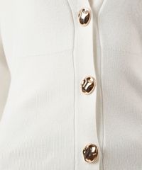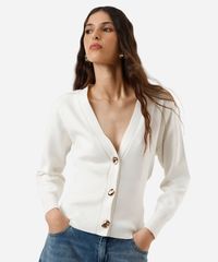 Cardigan feminino confeccionado em tricot encorpado com viscose e poliamida. A peça tem a modelagem acinturada e o caimento é ajustado ao corpo. O modelo tem decote V, fechamento por botões de forma orgânica e mangas longas. Detalhe de acabamento canelado nos punhos e na barra.