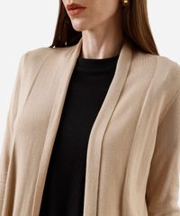Cardigan feminino confeccionada em tricot leve de viscose e poliamida. A peça tem a modelagem e construção reta, caimento solto ao corpo e comprimento alongado. O modelo é aberto com mangas longas e botões decorativos nos punhos.