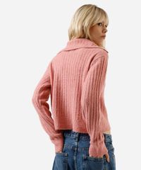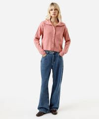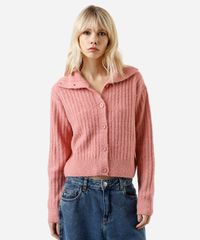 Cardigan feminino confeccionado em tricot com textura canelada e lã. A peça tem a modelagem e construção reta e o caimento é confortavelmente solto ao corpo. O modelo tem gola esporte, fechamento por botões e mangas longas.