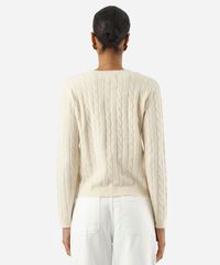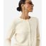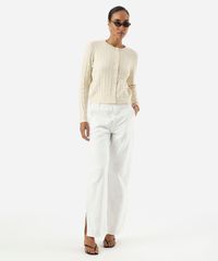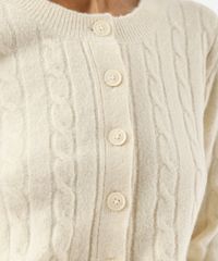 Cardigan feminino confeccionado em tricot texturizado com poliamida. A peça tem a modelagem e construção reta e o caimento é solto ao corpo. O modelo tem gola redonda, fechamento por botões em vista e mangas longas. Detalhe de acabamento canelado nos punhos e na barra.