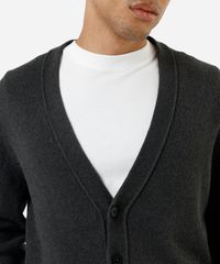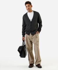 Cardigan masculino confeccionado em tricot de algodão. A peça tem a modelagem e construção reta caimento é solto ao corpo. O modelo tem gola V, fechamento por botões em vista e mangas longas. Possui acabamento canelado nos punhos e na barra.