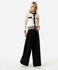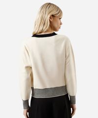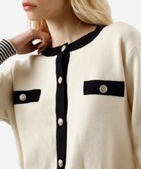 Casaco feminino confeccionado em tricot encorpado com viscose. A peça tem corte reto e o caimento é solto ao corpo. O modelo tem gola redonda, fechamento por botões com brasões e mangas longas. Possui dois bolsos decorativos e acabamento canelado e listrado nos punhos e na barra.