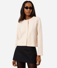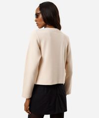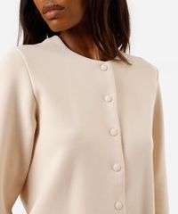 Casaco feminino confeccionada em malha com algodão. A peça tem a modelagem e construção reta e o caimento é confortavelmente solto ao corpo. O modelo tem decote redondo, fechamento por botões encapados em vista e mangas longas.