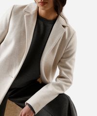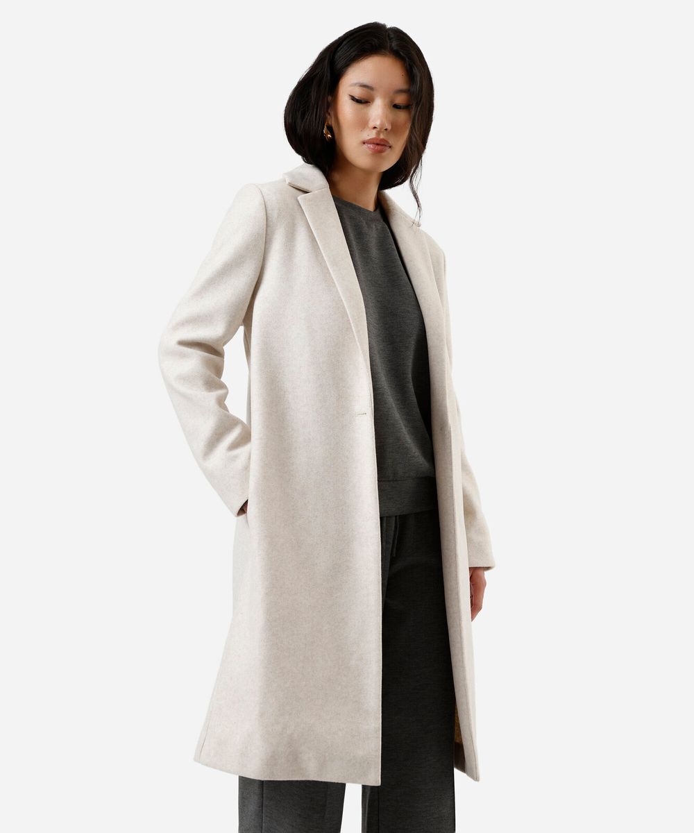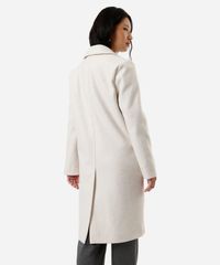 Casaco longo feminino confeccionado em tecido plano texturizado. A peça tem a modelagem e construção reta e o caimento é confortavelmente solto ao corpo. O modelo tem lapela clássica, fechamento por botões em vista e mangas longas. Possui dois bolsos laterais e acabamento com viés interno.
