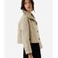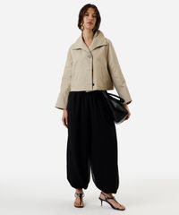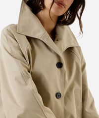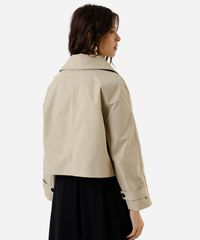 Casaco trench coat feminino confeccionado em sarja. A peça tem modelagem reta , caimento solto ao corpo e comprimento curto. O modelo tem gola alta, fechamento por botões e mangas longas com martingales nos punhos. Possui dois bolsos funcionais e forro em tecido plano.