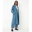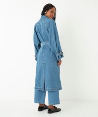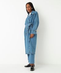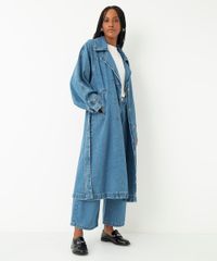 Use este casaco jeans aberto sobre uma camiseta básica e calça para um visual despojado e urbano. Para uma proposta mais elegante, use-o fechado e com a faixa amarrada na cintura, criando um efeito de vestido. Combine com botas de cano curto ou sapatos mocassim para um look de trabalho moderno, ou com tênis para um passeio no fim de semana.