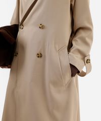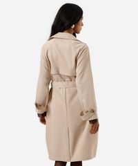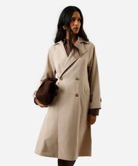 Casaco trench coat feminino confeccionado em tecido plano. A peça tem a modelagem e construção reta, caimento solto ao corpo e comprimento midi. O modelo tem lapela larga, fechamento por duplo abotoamento e mangas longas com martingales nos punhos. Possui dois bolsos, passantes aplicados, faixa para amarração e fenda na barra.